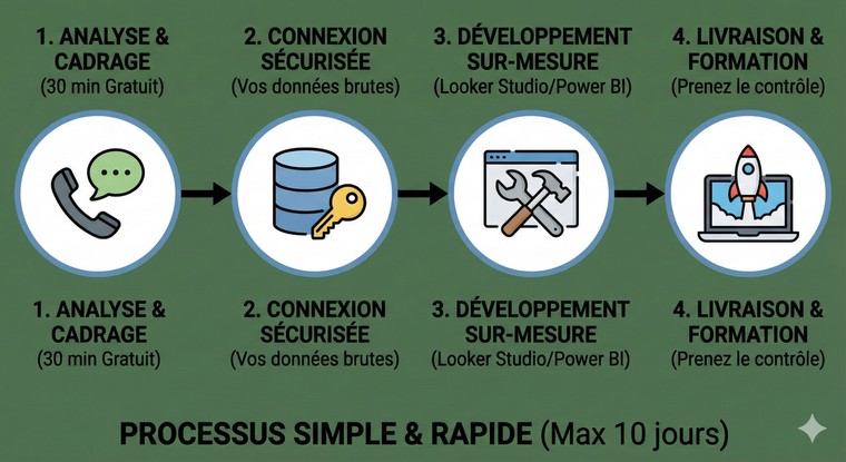 🛠️ Outil Garanti et Évolutif : Votre tableau de bord sera construit avec des technologies robustes (Looker Studio, Power BI, Excel avancé...) garantissant sa pérennité et sa capacité à intégrer de nouvelles données futures.