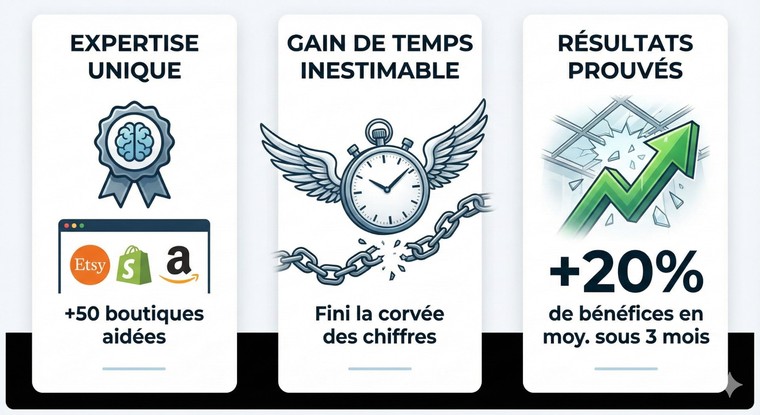 ⏱️ Gain de Temps Inestimable : Libérez des heures chaque semaine. Concentrez-vous sur la création de vos produits et le marketing, laissez-nous le fardeau des chiffres.