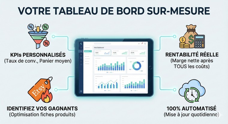 📈 Expertise Unique : Notre équipe est spécialisée dans l'e-commerce et a aidé plus de 50 boutiques Etsy à passer au niveau supérieur. Nous ne faisons pas que des tableaux de bord, nous créons des outils de croissance.