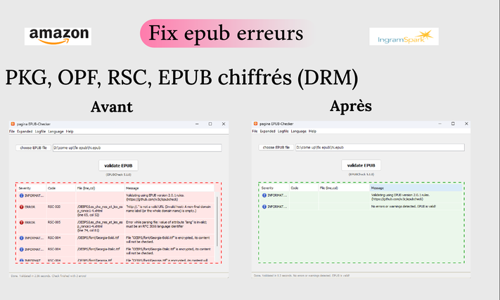 Je vous propose un service professionnel pour analyser et réparer votre fichier EPUB afin qu’il soit conforme aux standards internationaux et accepté sans erreurs.