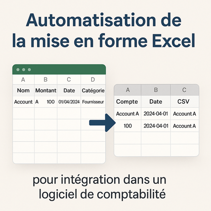 Ma solution : j’automatise la mise en forme de votre fichier Excel afin qu’il soit directement compatible avec votre logiciel comptable (Sage, EBP, Ciel, Quadra, etc.).