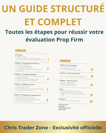 Je mets à votre disposition un guide complet, professionnel et prêt à l’emploi pour réussir votre évaluation Prop Firm efficacement, même si vous débutez.