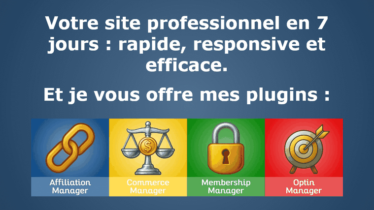 **Je vous offre mes plugins premium WordPress** (Affiliation Manager, Commerce Manager, Membership Manager et Optin Manager).