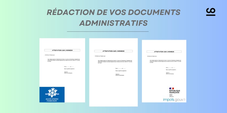 Attestation sur l’honneur (hébergement, revenus, situation familiale, non-imposition, etc.), courrier à l’administration (CAF, impôts, préfecture, mairie, école, employeur, etc.), lettre de résiliation (assurance, logement, contrat divers).