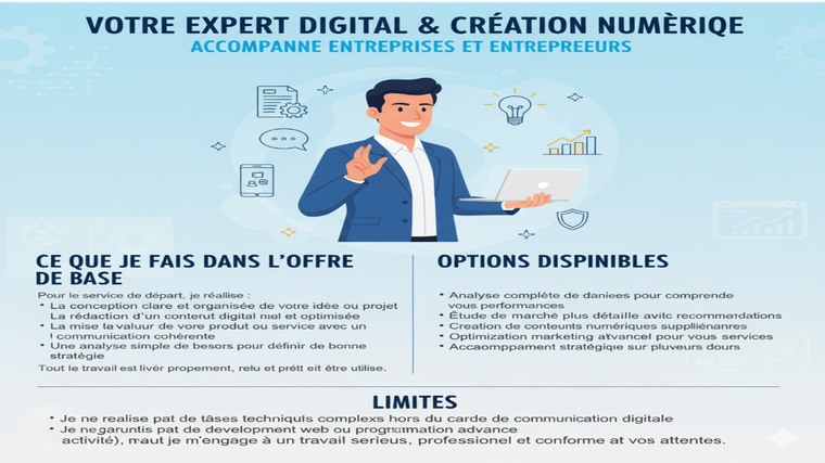 je suis spécialiste du digital et de la création numérique et j’accompagne entreprises et entrepreneurs dans la mise en valeur de leur marque et de leurs projets. grâce à mon expérience en communication digitale en analyse de données et en étude de marché je vous aide à développer une présence professionnelle cohérente et performante.