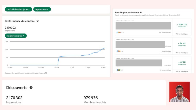 Je suis créateur LinkedIn avec plus de 4500 abonnés en 3 mois, plus de 100 000 impressions par semaine lors de mes meilleurs pics, et plusieurs posts viraux.