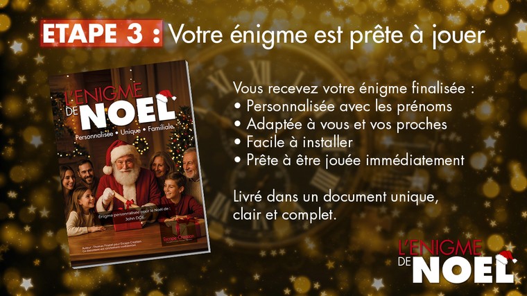 Je conçois pour vous une énigme sur-mesure complète, avec une introduction narrative, des étapes claires et des conseils d’installation faciles à suivre.
