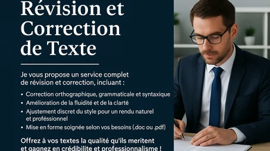 Professionnel rigoureux et orienté excellence, j’accompagne entreprises, marques et indépendants dans la création et l’optimisation de contenus clairement structurés, élégants et stratégiquement pensés. Mon approche repose sur une compréhension précise des besoins, une analyse approfondie des objectifs et une maîtrise avancée des standards de communication moderne. Chaque texte que je produis est conçu pour renforcer votre crédibilité, clarifier votre message et valoriser votre image auprès de votre audience. J’interviens principalement dans : la rédaction de contenus professionnels et institutionnels, la mise en forme de présentations ou descriptions à forte valeur ajoutée, l’amélioration et la restructuration de messages pour plus de clarté, de cohérence et d’impact, l’accompagnement éditorial pour renforcer la visibilité, la confiance et la qualité perçue de votre marque. Reconnu pour mon sérieux, mon sens du détail et ma capacité à livrer des résultats précis et élégants, je m’engage à fournir un travail irréprochable, adapté à vos objectifs et parfaitement aligné avec votre identité. 👉 Disponible, réactif et entièrement dédié à la qualité du rendu final. Chaque projet est traité avec professionnalisme, confidentialité et une attention particulière au ton, à l’image et à la cohérence globale.