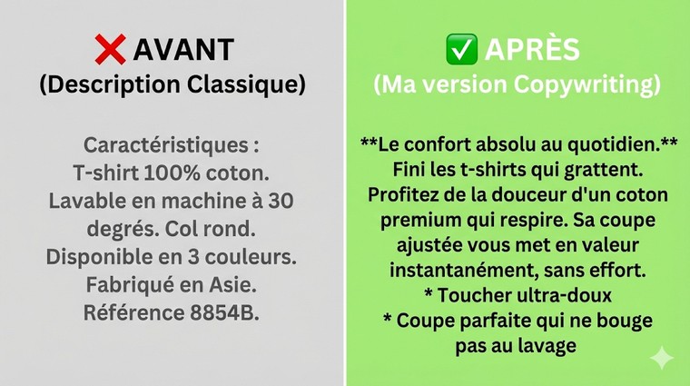 Je ne suis pas une intelligence artificielle ni un rédacteur qui fait du remplissage. Je suis un copywriter spécialisé en E-commerce. Ma méthode combine deux piliers essentiels :