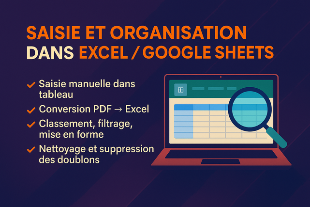 Je saisis vos données ligne par ligne, je** vérifie la cohérence**, j’uniformise les formats et j’applique une mise en page claire.