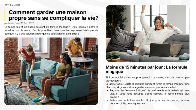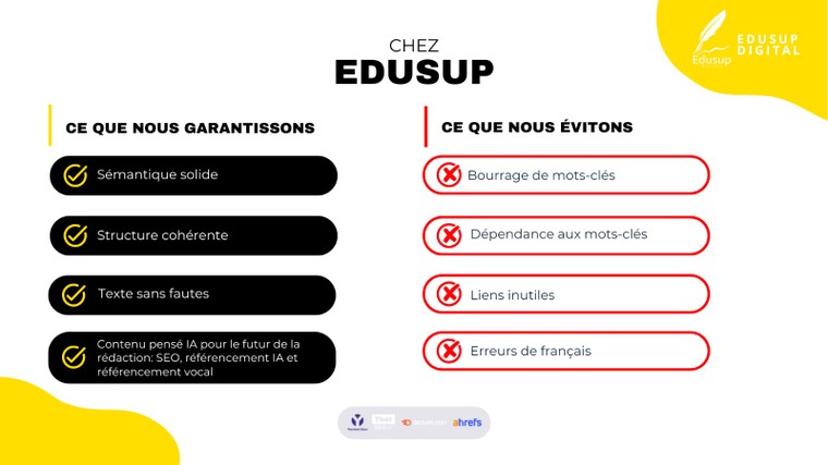 Notre équipe est composée de rédactrices professionnelles confirmées. Nous garantissons que chaque ligne est le fruit d'une analyse, d'une recherche et d'une écriture intellectuelle. Nous n'utilisons aucun outil d'IA pour la production du texte. Cela se traduit par une meilleure compréhension des nuances, un ton plus authentique et une plus grande crédibilité pour votre marque.