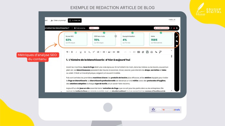 Optimisation Sémantique Utilisation d'outils experts comme Thot SEO et Semrush pour enrichir la sémantique et renforcer l'autorité de l'article sur son sujet. Maximiser la compréhension du sujet par Google.