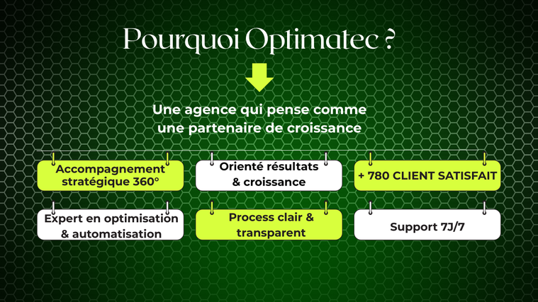 Je suis le fondateur d’Optimatec, une agence spécialisée en stratégie marketing et en technologies appliquées. Mon objectif : optimiser, automatiser et propulser les performances de ton entreprise 🚀 Grâce à Optimatec, j’aide les entrepreneurs à mettre en place des systèmes intelligents capables de vendre plus vite, toucher plus large et fonctionner plus efficacement. J’ai développé une méthode d’“augmentation technique” qui transforme ton activité en un moteur de croissance automatique et durable ⚙️📈 💡 Ma mission est simple : optimiser, améliorer, propulser. Je crée des stratégies puissantes, des automatisations sur mesure et des systèmes conçus pour réduire tes tâches répétitives tout en augmentant ton chiffre d’affaires. Avec mon expertise, je deviens plus qu’un prestataire : je suis ton accélérateur de croissance. Je t’accompagne dans chaque étape, de l’audit à l’implémentation, toujours avec des solutions claires, efficaces et adaptées à ton business. 👉 Je travaille à seulement 6,99€ de l’heure, pour offrir aux entreprises un accès accessible et performant aux technologies et stratégies haut niveau 💸✨ Si tu veux une entreprise plus fluide, plus intelligente et plus rentable, Optimatec est l’allié qu’il te faut 🔥