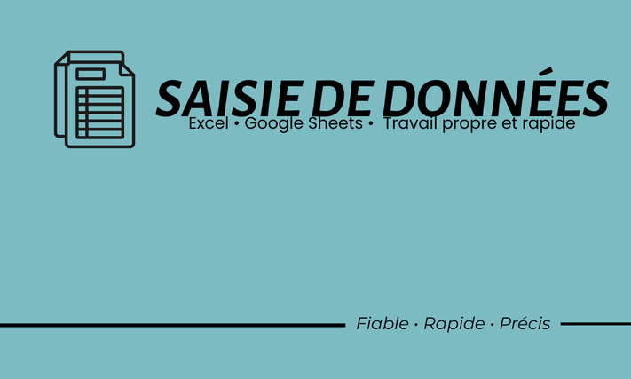 Je saisis vos données avec précision en respectant votre format et vos consignes. Pour cette offre, je réalise jusqu’à 100 lignes de saisie de manière propre et organisée. Que ce soit pour remplir un tableau, copier des informations ou mettre au propre un fichier, je vous livre un résultat clair, structuré et directement exploitable pour votre travail.