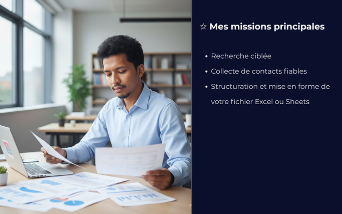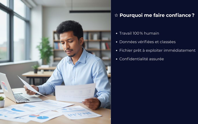 Je réalise une recherche manuelle professionnelle selon vos critères, puis je vous fournis un fichier clair, organisé et prêt à utiliser.