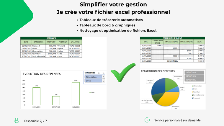 Je crée pour vous un tableau de trésorerie automatisé, simple d’utilisation, professionnel et parfaitement adapté à vos besoins.