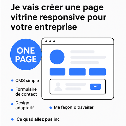 Avec cette offre, je crée pour vous une page “one-page” professionnelle qui rassemble l’essentiel : présentation, services, preuves de confiance et formulaire de contact.
