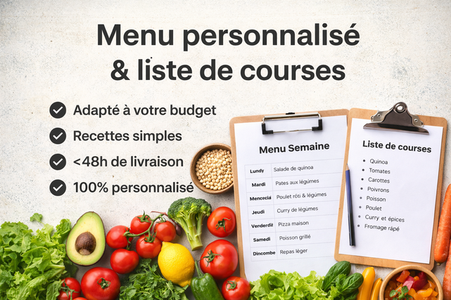 Proposé par jeremie_etave •Je crée votre menu personnalisé + liste de courses adaptée à votre budget et vos goûts Professionnel Vente au total 0