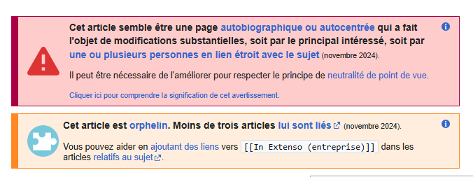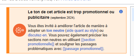 - Bandeaux rouges : Problèmes graves nécessitant intervention urgente (absence totale de sources, contenu promotionnel marqué, violation présumée de neutralité, admissibilité fortement contestée, etc.)