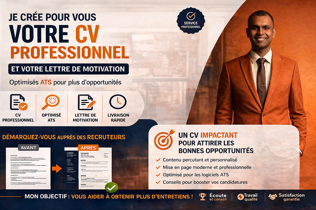 Je vais créer pour vous un CV professionnel, moderne et optimisé ATS, accompagné d’une lettre de motivation percutante adaptée à votre profil.