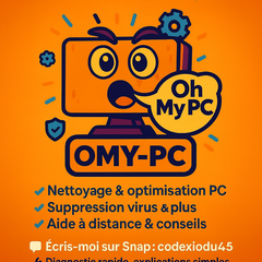 Besoin d’un coup de main pour votre PC ? Je vous aide rapidement à distance (AnyDesk/TeamViewer) ou sur place dans le Loiret. Je peux intervenir pour : PC lent / optimisation (démarrage, nettoyage, stockage) Suppression virus / pub / malware Problèmes Windows (bugs, mises à jour, erreurs) Installation logiciels / imprimante / scanner Connexion Internet / Wi-Fi / partage de fichiers Sauvegarde, récupération de fichiers, transfert vers nouveau PC Aide bureautique (Word/Excel, mail, comptes, etc.) 🕒 Dispo : réponse rapide, interventions possibles le jour même selon le cas. 🔒 Je respecte vos données : je demande uniquement ce qui est nécessaire, et je peux travailler en partage d’écran.