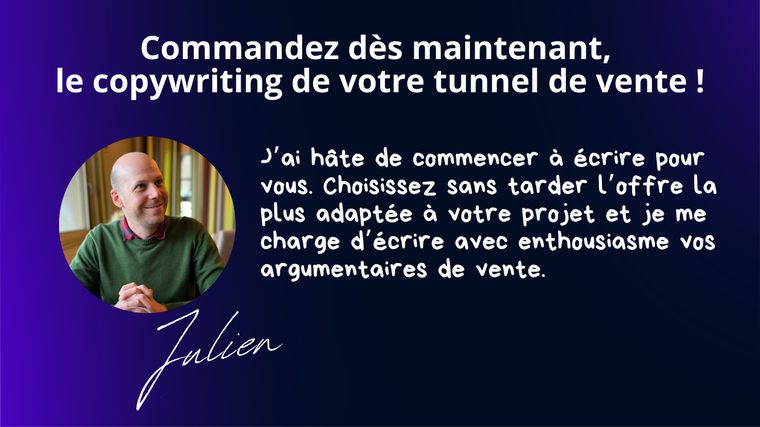 Je m'appelle Julien, et j'écris des pages de vente qui convertissent depuis une dizaine d'années. Ma spécialité ? Les tunnels de vente complets, clé en main. De la première ligne de votre page de vente à vos offres complémentaires, je m’occupe de tout pour que vous puissiez vous concentrer sur votre expertise.