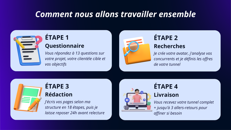 Créer un tunnel de vente efficace peut vous prendre plusieurs semaines. Entre la structure de la page de vente, les offres complémentaires, les upsells, les downsells et tous les contenus qui vont avec... c'est un véritable marathon d'écriture qui demande du temps et une expertise solide.