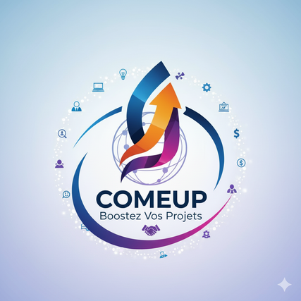 Le logo est centré sur une dynamique d'ascension et de réussite. Il combine une flèche pointant vers le haut avec des courbes fluides et modernes, symbolisant la croissance exponentielle et l'agilité. L'icône est entourée d'une orbite circulaire qui évoque un service complet, structuré et maîtrisé de A à Z.