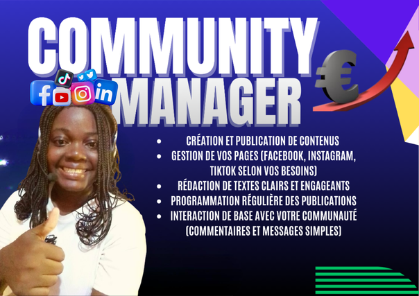 Bonjour et bienvenue 😊 Je m’appelle Ana, je suis créatrice de contenus digitaux et community manager. J’accompagne particuliers, entrepreneurs et entreprises dans la mise en valeur de leur image sur les réseaux sociaux et supports de communication. Je propose des services professionnels tels que : ✔️ gestion de pages Facebook, Instagram, TikTok ✔️ création d’affiches publicitaires attractives ✔️ vidéos publicitaires dynamiques et impactantes ✔️ montage de vidéos de conférences, événements et annonces ✔️gestion des services après vente SAV Mon objectif est simple : vous aider à attirer plus de visibilité, plus d’engagement et plus de clients grâce à des contenus clairs, modernes et efficaces. Sérieuse, à l’écoute et respectueuse des délais, je mets mon savoir-faire à votre service pour des résultats professionnels, même avec un petit budget. 📩 N’hésitez pas à me contacter pour discuter de votre projet, je serai ravie de vous accompagner.
