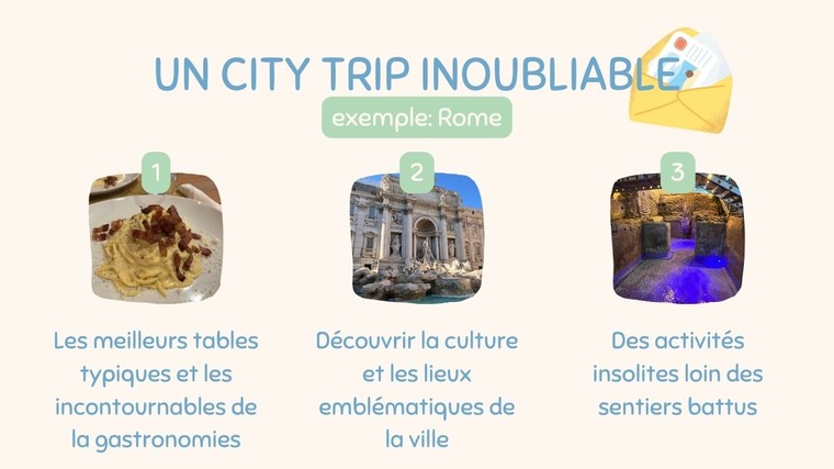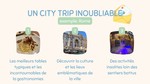 - un itinéraire de road trip gourmand dans la ville de votre choix et adapté à votre budget, dans lequel vous trouverez 4 étapes (apéritif, entrée, plat et dessert) dans 4 lieux différents de la ville