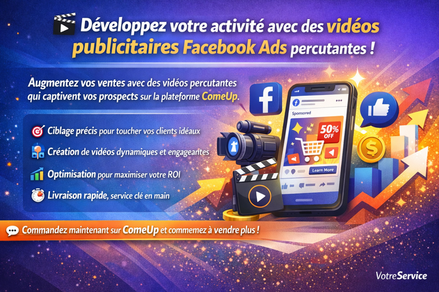 En tant qu’expert en **création de vidéos publicitaires Facebook Ads depuis plus de 5 ans**, je conçois des vidéos **dynamiques, engageantes et orientées conversion**, spécialement pensées pour capter l’attention en quelques secondes et **pousser vos prospects à passer commande sur ComeUp ou ailleurs**.