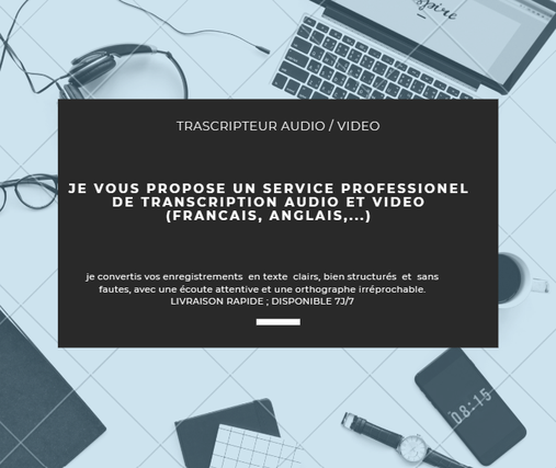 Je propose un service de transcription audio/vidéo fiable, rapide et soigné, adapté aux professionnels comme aux particuliers.