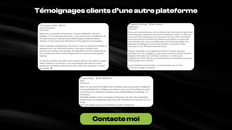 Salut ! Je m’appelle Eliott, Je suis expert & Lead CRO au sein d’une des meilleures agences d’optimisation e-commerce, spécialisée sur Shopify. J’aide les e-commerçants à maximiser leurs conversions, booster leurs ventes, et optimiser leur boutique sans tout refaire. Je propose : Analyse gratuite de ta boutique (vidéo de 5 min) Analyses avancées et recommandations actionnables Coaching stratégique pour scaler tes ventes J’ai déjà accompagné des marques comme My Variations, Hydratis, Humble+, French Mush, Flytex, Boku et bien d’autres. 🎯 Si tu veux comprendre pourquoi ta boutique ne convertit pas et comment y remédier, contacte-moi pour ton analyse gratuite !