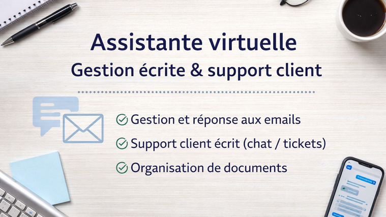 Je prends en charge vos tâches écrites et de support client, dans un cadre structuré et professionnel.