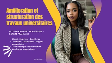 Je propose des services d’accompagnement académique et linguistique à destination des étudiants et des professionnels. J’interviens dans la rédaction et l’amélioration de travaux universitaires (mémoires, dissertations, rapports, projets de recherche), en aidant à structurer les idées, renforcer la logique argumentative, améliorer la clarté du raisonnement et la qualité rédactionnelle, dans le respect des exigences universitaires. Mon approche est méthodologique et rigoureuse : je n’écris pas à la place de l’étudiant, mais je l’aide à produire un travail clair, cohérent et solide. Je propose également des services de traduction français ↔ anglais, pour des documents académiques, professionnels ou généraux. Les traductions sont fidèles au sens, adaptées au contexte et rédigées dans un français et un anglais naturels et fluides. Une attention particulière est portée à la terminologie, au style et à la cohérence du texte. Sérieuse, organisée et attentive aux détails, je m’engage à fournir un travail soigné, dans le respect des délais et de la confidentialité.