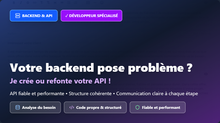 Développeur backend spécialisé, je conçois des APIs et des logiques serveur claires, fiables et pensées pour durer. Dans cette offre, j’analyse votre besoin, votre existant si nécessaire, puis je mets en place une structure backend cohérente adaptée à votre projet. Vous recevez un code propre, compréhensible et exploitable, avec une communication claire à chaque étape pour que vous sachiez exactement ce qui est fait et livré.