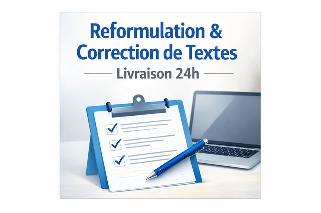 Je suis spécialisé dans la reformulation et la correction de textes professionnels, messages clients et annonces, avec un objectif clair: améliorer la lisibilité, le professionnalisme et l’impact de vos communications.