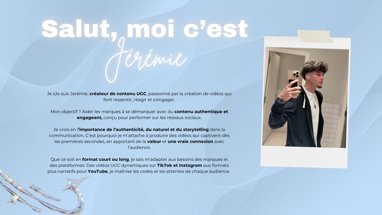 Créateur de contenu UGC basé à Paris, passionné par les vidéos authentiques, dynamiques et spontanées. Pas de perfection artificielle : je mise tout sur le réel, l’énergie et les moments qui font vraiment réagir. Je crée surtout des vlogs énergiques, où je découvre des lieux, teste des produits et relève des challenges, parfois entouré de mes amis pour garder une vibe naturelle et relatable. Ma force : capturer des moments vrais qui connectent vraiment avec l’audience. Mon objectif ? Aider les marques à se démarquer avec du contenu engageant, pensé pour performer sur TikTok, Instagram ou YouTube. J’accorde une vraie importance au storytelling, au naturel et à la capacité à captiver dès les premières secondes. Que ce soit en format court ou long, je m’adapte aux besoins des marques et aux codes de chaque plateforme pour créer des vidéos qui font ressentir, réagir et s’engager.