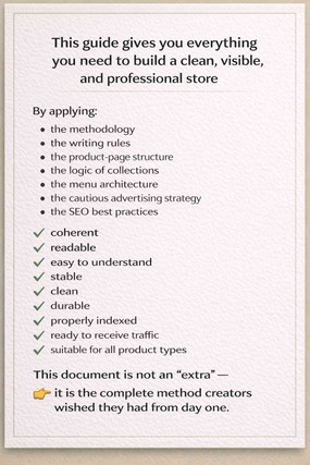 Every section related to product creation, collections, images, tags, and structure is explained with extreme precision and detailed methodology, ensuring that nothing is forgotten when writing a product page, for maximum SEO performance and long-term visibility.
