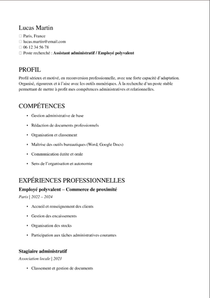 Je suis rédacteur de CV et lettres de motivation, spécialisé dans les profils étudiants, débutants et en reconversion professionnelle.