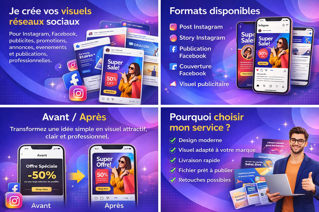 Je suis designer graphique et je vous propose de créer un visuel professionnel, moderne et attractif pour vos réseaux sociaux (Instagram, Facebook, etc).