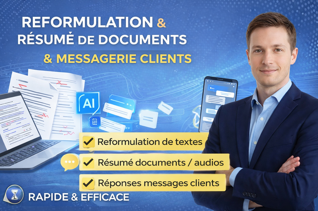 Bonjour ! Je propose des services simples mais efficaces pour vous aider avec vos textes et documents. Je peux : -Reformuler vos textes -Résumer vos documents ou audios -Répondre à vos messages clients rapidement Travail soigné et livraison rapide. N’hésitez pas à me contacter, je réponds vite !