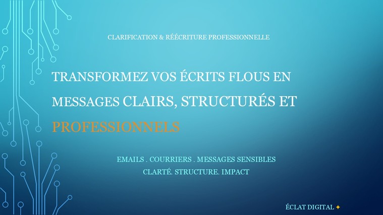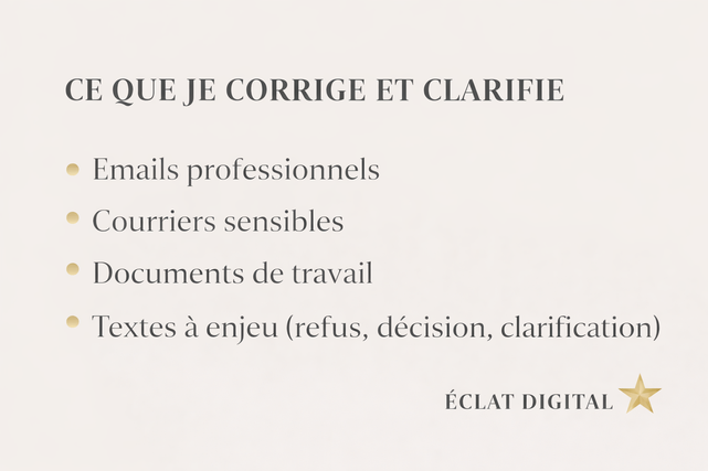 J’accompagne particuliers, entrepreneurs et indépendants dans la correction, la reformulation et la mise en forme de leurs documents écrits. Mon objectif est de clarifier les textes, améliorer la lisibilité et proposer des documents soignés, structurés et professionnels, adaptés à un usage personnel ou professionnel. J’interviens notamment sur : – textes et documents écrits – emails professionnels – documents administratifs Chaque prestation est réalisée avec méthode, rigueur et sens du détail, dans le respect des consignes et des délais. Éclat Digital ✦ — la clarté et l’élégance au service de vos contenus.