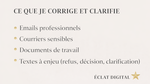 Je structure et reformule vos écrits professionnels pour qu'ils soient précis, cohérents et assumés.
