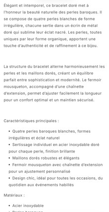 Spécialisée dans l'e-commerce (avec des résultats prouvés sur des niches compétitives comme les "bijoux acier inoxydable"), je rédige pour vous 5 fiches produits conçues pour plaire à la fois aux algorithmes de Google et à vos futures clientes. 💎