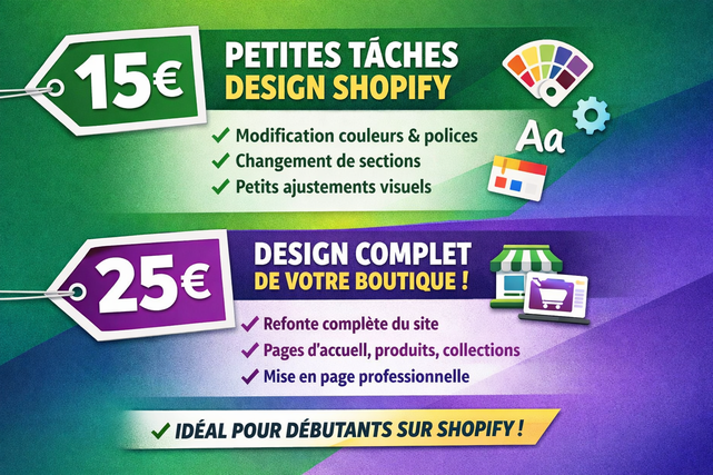 Bonjour, je débute sur Shopify et je propose mon aide pour des tâches simples de branding et de design. Je suis sérieux, appliqué et je prends le temps de bien faire chaque mission demandée. Je peux modifier les couleurs, les polices, l’apparence générale, le header, le footer et certaines sections de votre boutique. Je peux aussi améliorer le visuel d’une page produit ou d’une collection existante. J’accompagne également les commerçants qui souhaitent passer sur Shopify ou démarrer leur boutique simplement. Étant débutant, je fais très attention aux consignes et à la satisfaction du client. N’hésitez pas à me contacter avant commande afin de vérifier si votre demande correspond à mes compétences et attentes.