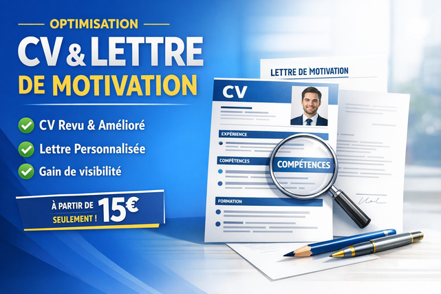 Je vous propose la correction et l’optimisation professionnelle de votre CV ou de votre lettre de motivation, avec une approche simple, structurée et rassurante, particulièrement adaptée aux profils débutants, en reconversion ou peu à l’aise avec cet exercice.