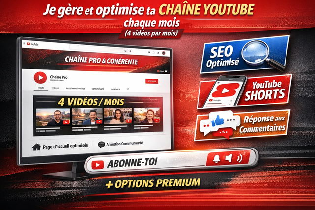 Je vais gérer et optimiser votre chaîne YouTube chaque mois pour la rendre professionnelle et active