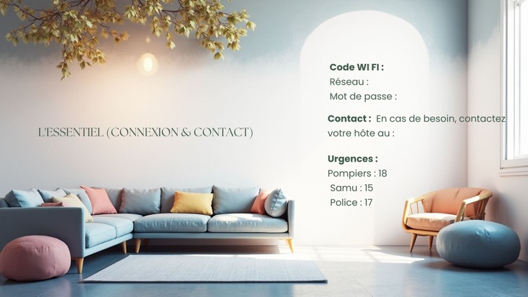 Inclus : Règles de la maison, codes Wi-Fi, recommandations locales et check-out.