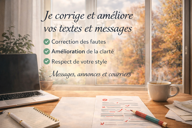 Bonjour et bienvenue, Je vous propose une aide simple et soignée pour la correction, la reformulation et l'amélioration de vos textes et messages. Que ce soit pour un message personnel, un courrier, une annonce ou un texte à clarifier, je travaille avec attention afin de rendre votre contenu plus clair, fluide et agréable à lire, tout en respectant votre style et votre intention. Sérieuse, organisée et à l'écoute, je m'engage à fournir un travail propre, discret et dans les délais convenus. N'hésitez pas à me contacter avant commande si vous avez une demande particulière.